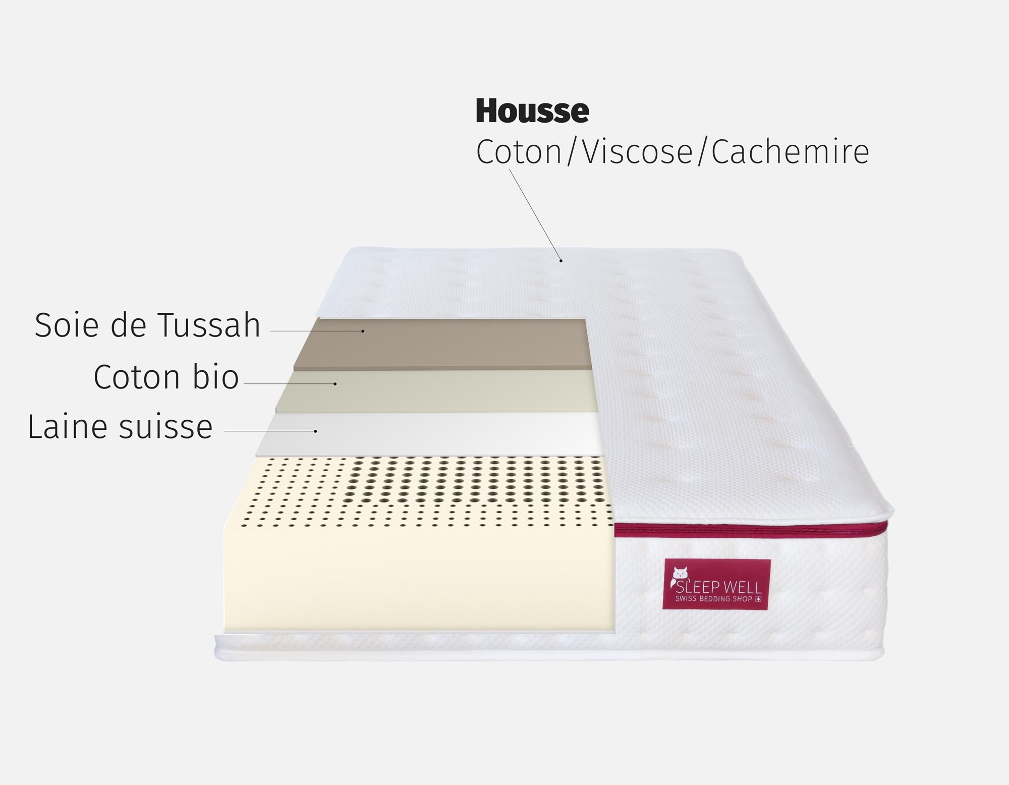 Housse en coton, viscose et cachemire renfermant un garnissage traditionnel et 100% naturel composé de laine vierge, de coton bio et de soie de Tussah.
